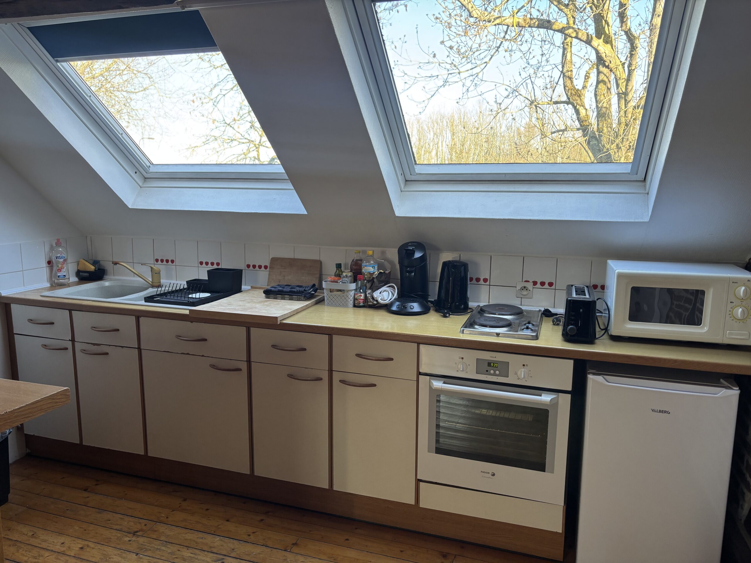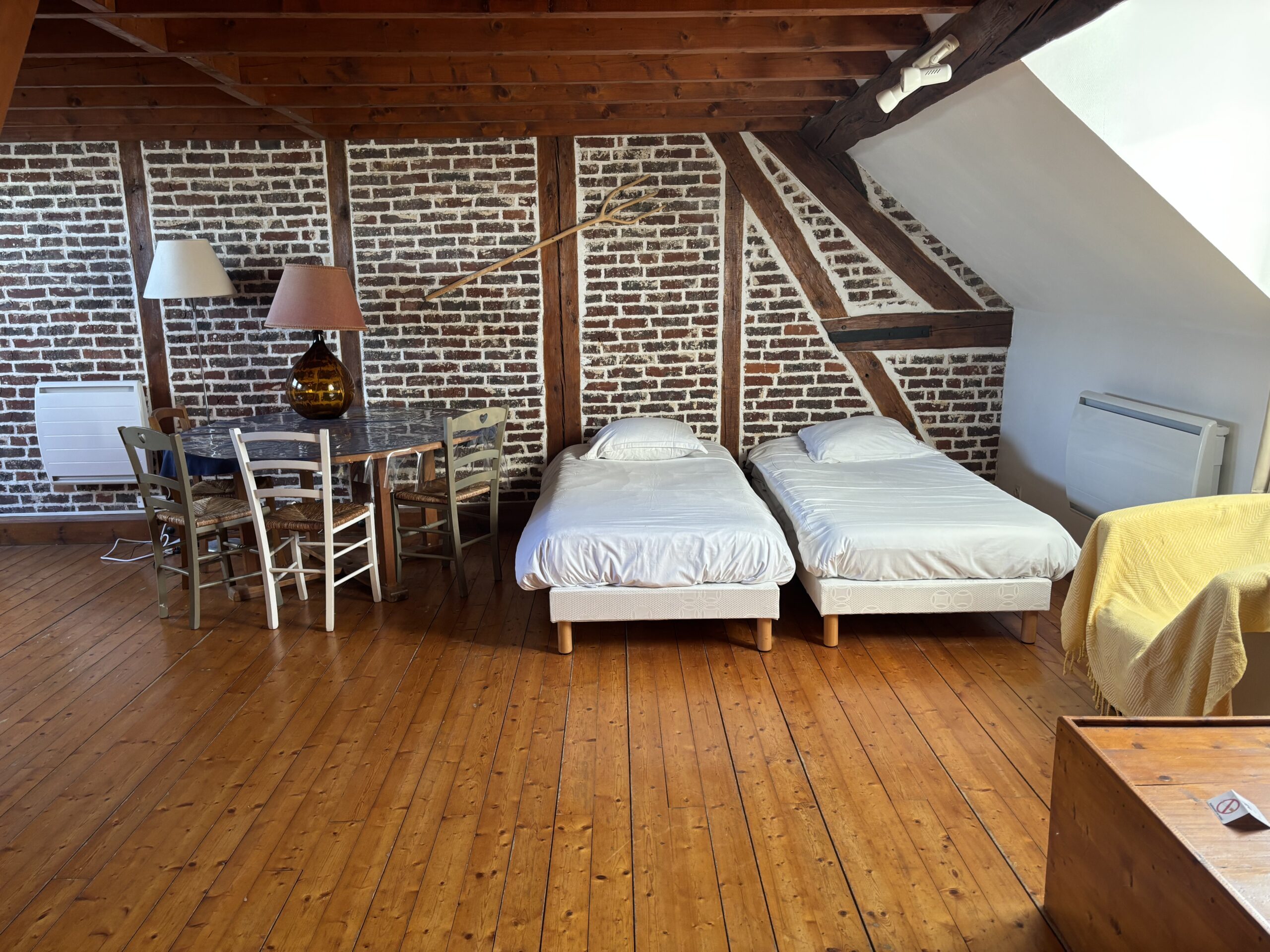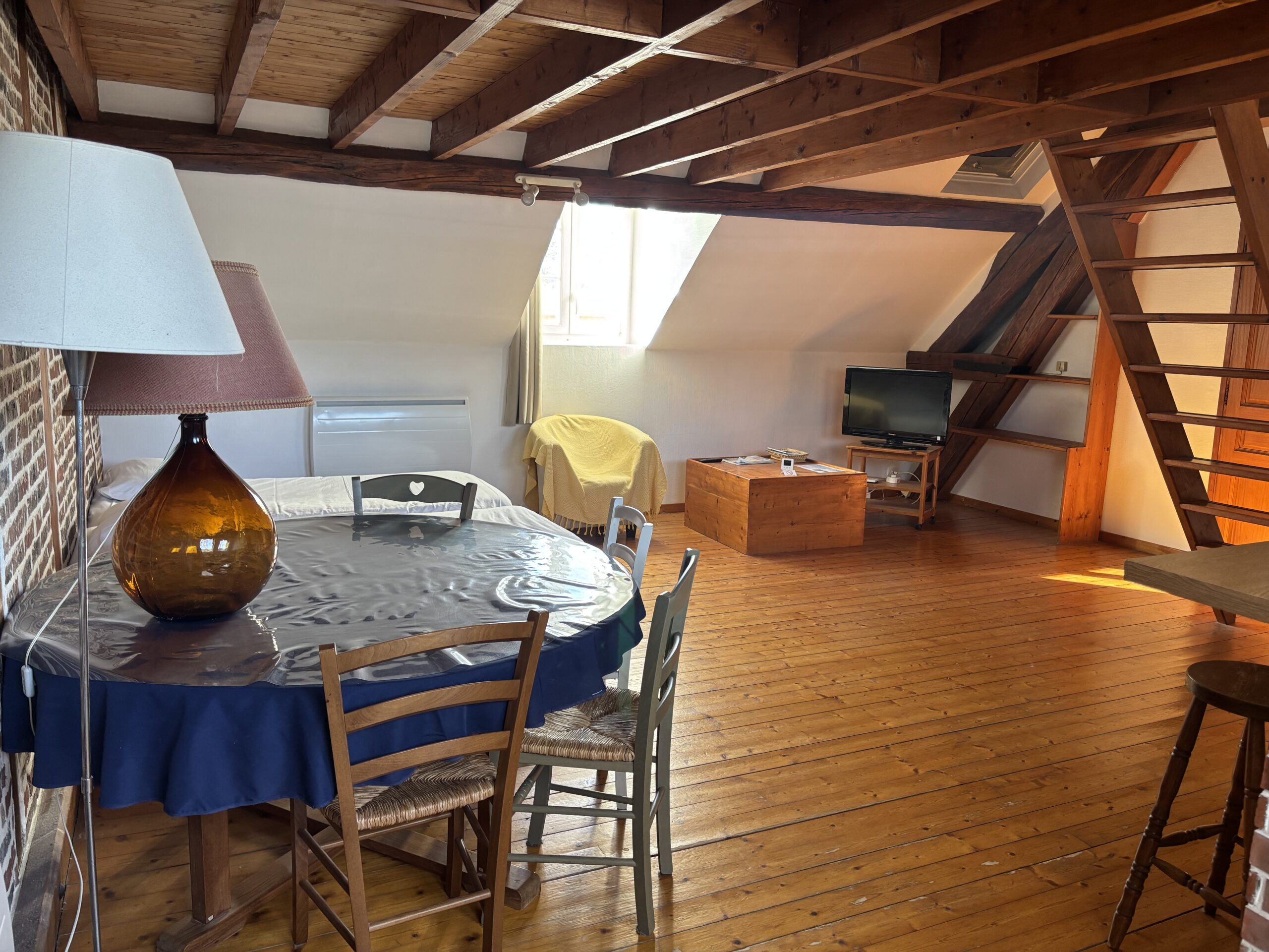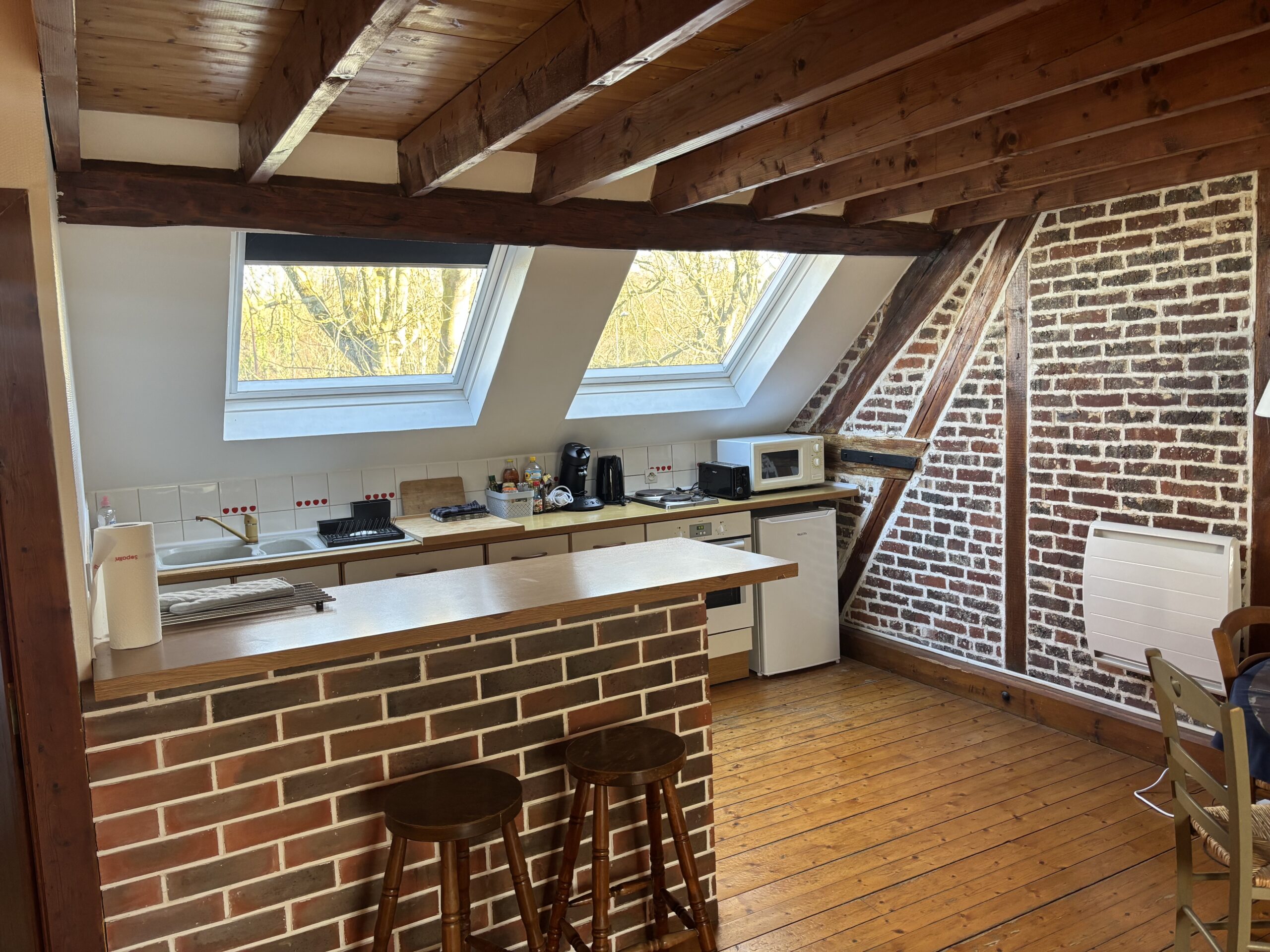 Notre gîte « Hiver » mesure 37 m2 et peut accueillir de 2 à 4 personnes. Laissez-vous séduire par son mur en briques, ses belles poutres et son joli parquet. Il est composé d’une chambre avec un lit double, un salon avec deux lits simples, une salle de bain avec wc et d’une cuisine équipée.